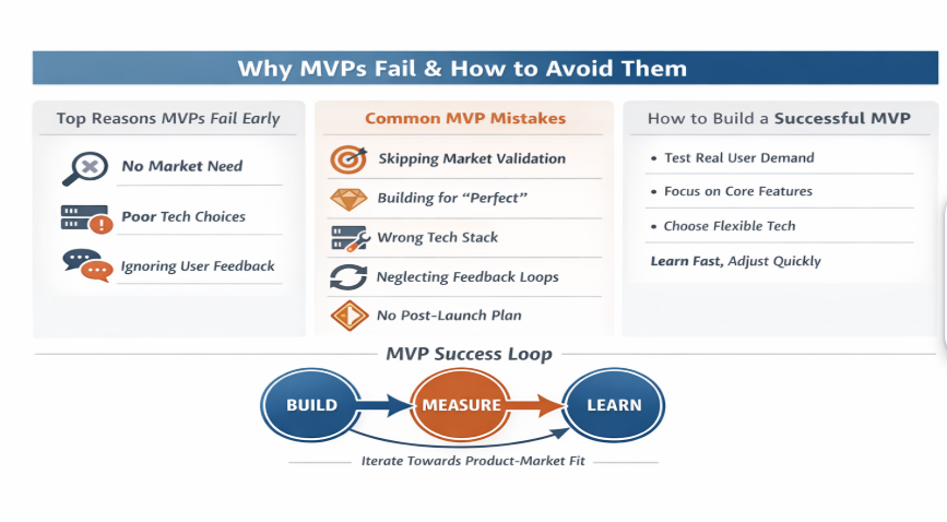 Many MVPs fail because feedback is sporadic and post-launch decisions are reactive. Without structured feedback loops and a clear plan, teams end up chasing noise instead of learning. Effective MVPs embed feedback into the product, capturing input at meaningful moments and combining quantitative data (what users do) with qualitative insights (why they do it). Defining success signals upfront—such as activation, retention, or engagement depth—and mapping them to clear decisions to iterate, pivot, or pause prevents premature or misaligned changes.