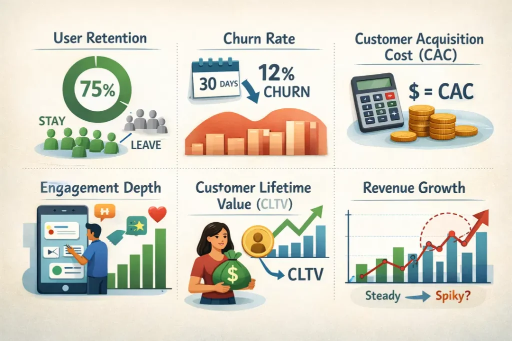 The foundation of scaling lies in understanding what your numbers are really telling you. Vanity metrics (like downloads or page views) look good in pitch decks, but they rarely reflect sustainable business health.